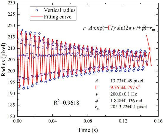 The acoustic excitation initially induced oscillations in the levitated drop around its resonant frequency. After the acoustic excitation ceased, the drop experienced a damped oscillation. Figure 10 illustrates the radius variations during the damped oscillation. A non-linear fitting to Equation (4) was performed to determine the damping constant, which was then used to calculate viscosity.