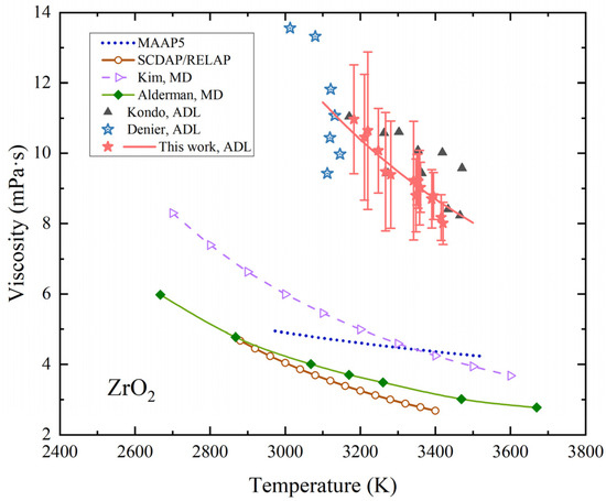 The measured viscosity data for liquid ZrO2 are presented in Figure 11, alongside published data and models. The viscosity equations of ZrO2 derived by MD calculations or used in codes are also given in Table 2. The temperature dependence of viscosity follows the Andrade equation [38]: