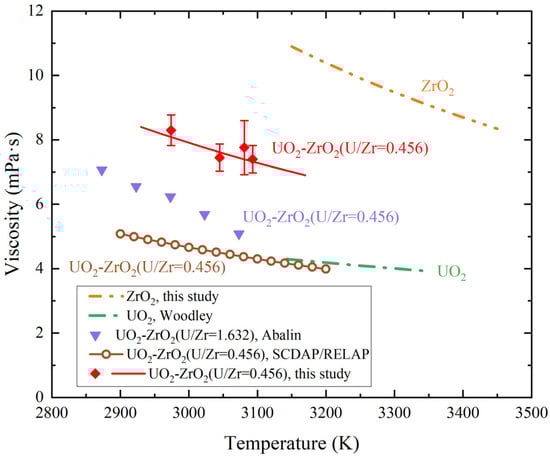 The viscosity of the UO2-ZrO2 mixture with a U/Zr molar ratio of 0.456 was measured using the same methodology as that applied to ZrO2, with the results presented in Figure 12. The maximum uncertainty was determined to be 10.8%. Given the scarcity of experimental data, viscosity values for other corium components, including ZrO2, UO2 [40], and the UO2-ZrO2 mixture (U/Zr = 1.632) [7], are also included for comparison. Overall, the data obtained in this study align with the observed trends in viscosity as the composition varies.