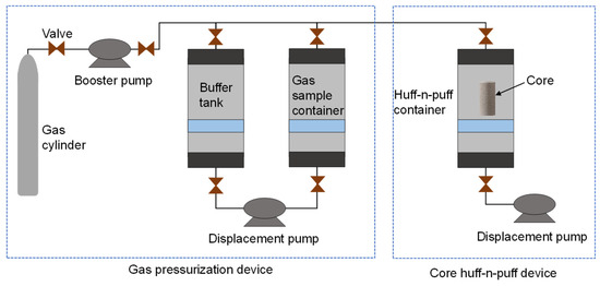 A scanning electron microscope (SEM) is utilized to observe the microstructure of shale samples in detail, focusing on pore morphology and fracture network characterization. By comparing SEM images of the rock’s microstructure before and after gas injection, we can visually evaluate structural changes and the connectivity of the pore network during the injection process. This comparison helps clarify the effects of gas injection and the underlying micro-mechanisms of oil and gas flow. The SEM equipment employed in this study is a field-emission dual-beam electron microscope, model FEI Helios Nanolab 600i, manufactured by FEI Company (Hillsboro, OR, USA) and purchased from SEIR Network Co., Ltd. (Beijing, China). The porosity of the shale samples is determined by measuring the mass difference in saturated dodecane liquid, while permeability is assessed using the helium pulse method. The dodecane used is sourced from China National Pharmaceutical Group Chemical Reagents Co., Ltd. (Shanghai, China), with a purity of 99.99%, and the helium gas is provided by Qingdao Xinke Yuan Gas Co., Ltd. (Qingdao, China), also with a purity of 99.99%. A schematic diagram of the core-scale mixed gas injection experimental setup is shown in Figure 2. The main components of this setup include a core holder, a high-pressure vessel, a displacement pump, and micro gas and liquid measuring devices.