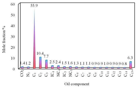 Based on the gas composition provided by the oilfield (Figure 4), mixed gases were formulated in the laboratory using gas state equations and mixing compressibility factors. The crude oil was then mixed with a gas-to-oil ratio of 90 m3/m3 to closely replicate the actual reservoir oil composition.