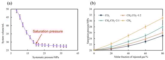 Isothermal constant composition expansion experiments (Figure 5a) determined the saturation pressure of the crude oil to be 20.1 MPa. When the system pressure dropped below this value, gas bubbles formed in the oil, causing rapid volume expansion. Results from constant composition expansion experiments with various injected gases (Figure 5b) indicated that the saturation pressure increased with the molar fraction of the injected gas, although the effects varied significantly across different gas combinations. The study by Li et al. [] also confirmed this conclusion, showing that when the CO2 mole fraction increased from 0% to 45%, the crude oil saturation pressure increased by approximately 1.6 times. However, this study found significant differences in the impact of different gas combinations on saturation pressure. Among these, pure CH4 resulted in the highest saturation pressure, with the most pronounced pressure increase as the mole fraction rose. When the mole fraction of the injected gas reached 80%, the saturation pressure was 1.5 times higher than in the initial state. This characteristic makes pure CH4 particularly effective in scenarios requiring rapid pressure enhancement and improved reservoir displacement. In contrast, pure CO2 exhibited the lowest saturation pressure at the same molar fraction. At an 80% molar fraction, the saturation pressure of pure CH4 was 1.24 times that of pure CO2. Furthermore, the increase in saturation pressure for pure CO2 was more gradual as the molar fraction rose. This suggests that CO2 has high solubility, enabling effective diffusion under low-pressure conditions and progressively enhancing oil recovery, making it suitable for stable, long-term pressurization strategies. In the case of mixed gases, a higher CO2 ratio (CO2 at 2:1) resulted in a saturation pressure close to that of pure CO2, albeit slightly higher, indicating that the presence of CH4 enhanced the compressibility of the mixed gas. Conversely, increasing the CH4 ratio significantly raised the saturation pressure, approaching that of pure CH4, further highlighting the pressure-enhancing role of CH4 in gas injection development. By comparing different gas combinations, it can be inferred that in actual reservoir development, selecting appropriate gas injection ratios based on specific needs allows for flexible adjustment of reservoir pressure enhancement rates and magnitudes, leveraging the rapid pressure boost of pure CH4, the stable pressure effects of pure CO2, or achieving an optimal balance through judicious mixed gas ratios for effective and economical oil recovery.