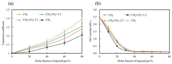 The variation in the crude oil expansion coefficient and viscosity under different gas media is shown in Figure 6. As the molar fraction of injected gas increases, the crude oil expansion coefficient gradually rises across different gas media. Specifically, when the CO2 molar fraction in the crude oil system increases from 0 to 80%, the expansion coefficient increases by 39%, while for CH4, it rises by 21%. The effect of the CH4/CO2 mixed gas lies between those of the two pure gases, with the expansion coefficient decreasing as the molar ratio of CH4 in the mixed gas increases. This suggests that a higher proportion of CH4 in the mixed gas leads to an effect more similar to that of CH4, resulting in a reduction in the overall expansion coefficient. This can be attributed to CO2’s high solubility and strong dissolving capability, which interact significantly with CH4 molecules in the crude oil, causing notable volume expansion. In contrast, CH4 has a relatively minor expansion effect. When the molar ratio of CH4 and CO2 in the mixed gas changes, the expansion coefficient reflects a value between those of the two pure gases. As the molar ratio of CH4 increases, the expansion coefficient approaches that of pure CH4, indicating that the addition of CH4 diminishes the expansion effect of CO2, reducing the overall expansion coefficient of the mixed gas. At the same time, the study by Habibi et al. [] showed that the expansion factor of crude oil in contact with gas is also time-dependent. Through visualized PVT experiments, they found that during the CO2 injection phase, the system pressure reached 13.8 MPa, and the expansion factor of crude oil was 1.23. After stopping CO2 injection, the system pressure decreased to 11.8 MPa after 5 h, while the crude oil expansion factor increased to 1.32. On the other hand, as the molar fraction of injected gas increases from 0 to 40%, a significant decrease in crude oil viscosity is observed, indicating that gas dissolution effectively alters the oil’s flowability during this stage. Within this range, both pure CO2 and CH4 substantially reduce the viscosity of crude oil through gas dissolution. Specifically, pure CO2 reduces crude oil viscosity by 94.4%, while pure CH4 reduces it by 94%. The effects are very similar, suggesting that the composition of mixed gases does not significantly affect the degree of viscosity reduction. This is consistent with the findings of Wang et al. [], who noted that while the addition of gases like C2 to CO2 reduced the viscosity-reducing effect, the decrease was relatively small. However, when the molar fraction of injected gas exceeds 40%, the viscosity of crude oil remains largely unchanged, indicating that further gas dissolution approaches saturation, and the oil’s flowability has reached its maximum improvement.