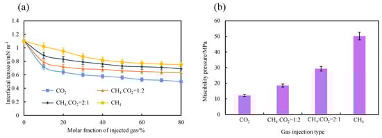 The changes in interfacial tension and miscibility pressure of oil and gas under different gas media are shown in Figure 7. As the molar fraction of injected gas increases, the interfacial tension between the gas and crude oil gradually decreases, indicating a significant impact of gas dissolution on interfacial behavior. Pure CO2 demonstrates the strongest capability in reducing interfacial tension, with a 54.54% reduction when its molar fraction reaches 80%, highlighting its robust regulatory influence on interfacial behavior. In contrast, pure CH4 exhibits a weaker effect, reducing interfacial tension by only 31.82% at 80% molar fraction. For CH4/CO2 mixed gases, the ability to reduce interfacial tension falls between those of the two pure gases, with this effect diminishing as the molar proportion of CH4 increases. This indicates that a higher CH4 component weakens the ability of the mixed gas to reduce interfacial tension, causing its behavior to align more closely with that of CH4. Consequently, under reservoir conditions, an increase in the CH4 ratio of the mixed gas leads to a rise in the minimum miscibility pressure (MMP), making it more difficult for the gas to achieve complete miscibility with crude oil. This is because CH4 is less effective than CO2 in reducing interfacial tension and promoting gas–oil mixing, requiring higher pressures to overcome interfacial tension for miscibility at higher CH4 ratios. Therefore, as the CH4 proportion in the mixed gas increases, the gas faces greater difficulty in achieving miscibility with crude oil, thereby affecting reservoir displacement efficiency and the overall effectiveness of gas injection. The miscibility of CO2 with crude oil involves two main physical and chemical processes: first, CO2 dissolves in the crude oil, and then CO2 extracts lighter CH4 components from the crude oil. This is the process of CO2 miscibility with crude oil [,]. Al Hinai et al. [] also measured the interfacial tension between crude oil and CO2-associated gas mixtures. They explained that the high miscibility pressure of associated gas is due to its significantly lower extraction effect on the light CH4 components in crude oil compared to pure CO2.
