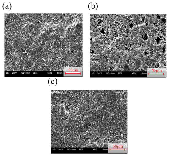 This study focuses on mixed gas components primarily composed of CO2 and CH4, and the SEM experiments specifically examine the effects of these gases on the microstructure of the rock. The original appearance of the rock sample is shown in the SEM image (Figure 8a), while the SEM images after treatment with pure CO2 and CH4 are depicted in Figure 8b and Figure 8c, respectively. It is evident that, following treatment with different gases, the shale surfaces exhibit varying degrees of dissolution. Specifically, the shale surface treated with CH4 appears smoother and denser, indicating a weaker dissolutive effect of CH4 and the preservation of a relatively intact rock surface structure. In contrast, the shale surface treated with CO2 displays a rougher, looser structure, with a greater generation of micropores, indicating a more pronounced dissolutive effect of CO2 and a higher degree of dissolution on the shale surface. Therefore, it is clear that the impact of different gas treatments on the shale structure varies significantly, with CO2 demonstrating a stronger dissolutive capacity that notably alters the microstructure of the shale.