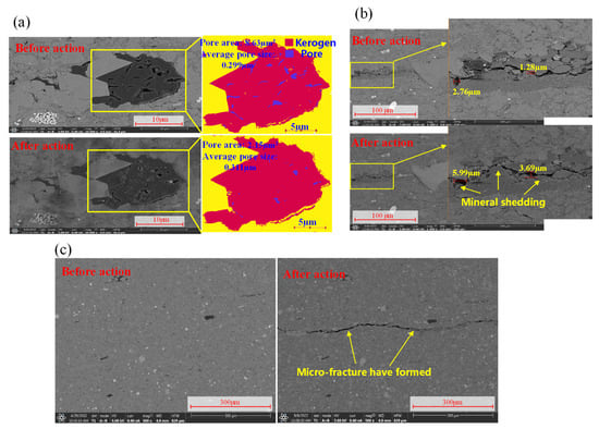 Thus, this study focuses on the changes in the rock’s microstructure before and after CO2 treatment. SEM images illustrating the effects of CO2 treatment on various regions of the rock are shown in Figure 9. It is evident that significant dissolution occurs in the pores surrounding the organic matter in the shale following CO2 treatment. Under the dissolutive action of CO2, some intergranular and intragranular micropores have expanded in size, while others have reduced due to the filling of detached minerals, resulting in pore sizes ranging from 0.4 to 1.2 times their original dimensions. Concurrently, the dissolution of minerals has increased pore sizes by 1.5 to 3 times, thereby enhancing the shale’s porosity. Additionally, several microfractures have formed, further altering the internal structure of the shale. These observations indicate that CO2 not only significantly impacts the pore structure around the organic matter but also markedly alters the pore network and microfracture distribution within the shale through its dissolutive action.