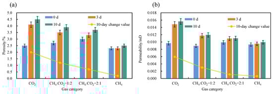 The change in shale physical properties under different gas effects: (a) the change in porosity under different gas effects and (b) the change in permeability under different gas effects.