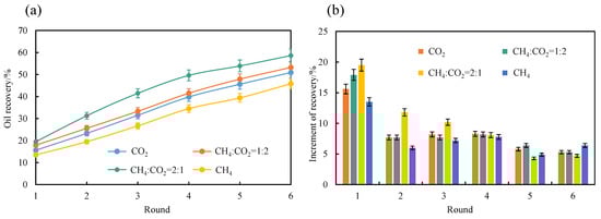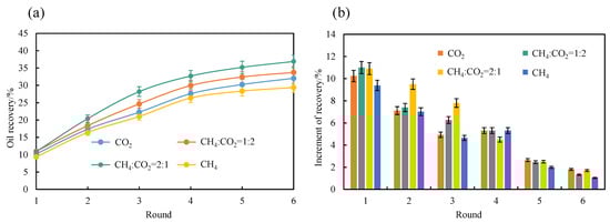 The effect of different gas injection huff and puff on the matrix core: (a) different rounds of gas injection recovery and (b) different rounds of gas to improve the recovery rate.