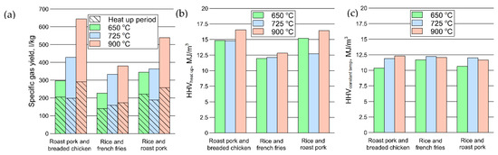 Figure 2a shows the specific dry gas yield at different temperatures, highlighting the portion of pyrolysis gas that evolved during the heat-up period. Higher temperatures resulted in higher specific gas yields, which is in agreement with the lower amount of char. The HHV of the gas during the heat-up period (Figure 2b) lay between 12.0 and 16.6 MJ/Nm3 under all nine measurements and the relatively high heating value can be elucidated by the significant hydrocarbon presence in the pyrolysis gas. The HHV of pyrolysis gas at constant temperature (Figure 2c) is generally lower compared to the heat-up period, typically laid between 10.3–12.3 MJ/Nm3, which is a result of CO + H2 rich pyrolysis gases (64–66 Vol% at 650 °C, 77–83 Vol% at 725 °C, 84–90 Vol% at 900 °C).