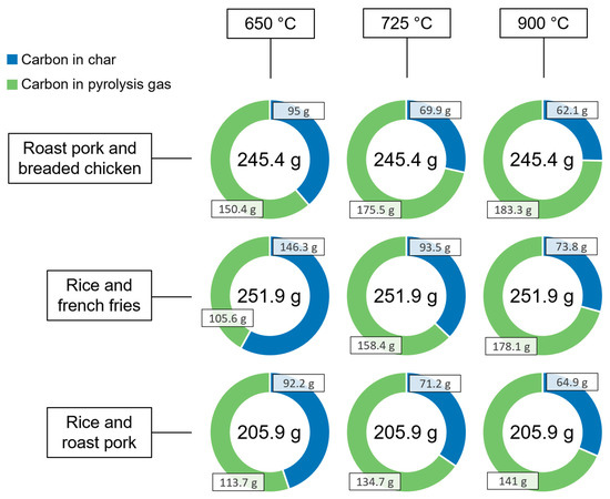 Figure 4 depicts the carbon flow of the pyrolysis process in various cases. The weight highlighted in the middle of the circle plots represents the total carbon input, while the portion of carbon appearing in pyrolysis gas and solid char is also presented. Basically, the carbon in pyrolysis gas is emitted in the form of CO2 due to the combustion of gases, and, on the other side, another portion of carbon remains in char in solid form. The char from the pyrolysis of rice and French fries resulted in the highest captured amount of carbon with 146.3 gC/kgsample, which equals to 536 gCO2/kgsample removed at 650 °C pyrolysis temperature. The blend of roast pork and breaded chicken resulted in a significantly lower capture potential being 348 gCO2/kgsample at 650 °C pyrolysis temperature. The pyrolysis temperature increase from 650 °C to 900 °C in the cases of roast pork and breaded chicken, rice and French fries, and rice and roast pork resulted in 34.6%, 50.4%, and 29.6% lower captured carbon, respectively.