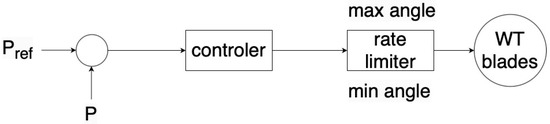 In the case of faults or low-voltage scenarios, the standard transfer of active power from the generator to the grid diminishes or halts, leading to an accumulation of excessive active power within the generating unit. This surge in active power leads to the overloading of the power converter. Pitch control restricts the input mechanical power and can mitigate the build-up of active power in the generating unit. Pitch control operates by adjusting the angle of attack of each blade, thereby reducing the mechanical power and consequently constraining the rotor speed and reactive power consumption post-fault. Figure 3 illustrates the fundamental concept of a pitch angle controller, where theta denotes the pitch angle [12]. This control technique should be integrated into the ongoing blade pitch control used in normal operating conditions. One approach is presented in [16].