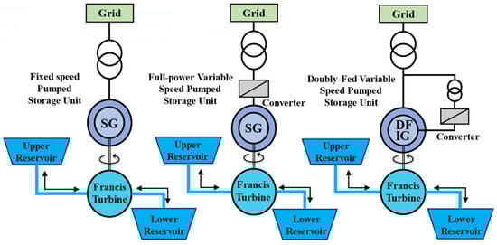 On the other hand, full-power variable-speed pumped storage units differ from fixed-speed units by having a full-power frequency converter between the stator and the grid. The principle of speed variation is similar to that of integrating new energy sources into the grid via power electronic devices []. Consequently, this technology is mainly applied to small-capacity variable-speed pumped storage stations, such as the Sichuan Chunchangba Pumped Storage Power Station. The specific structures of the three types of pumped storage power stations are shown in Figure 1.