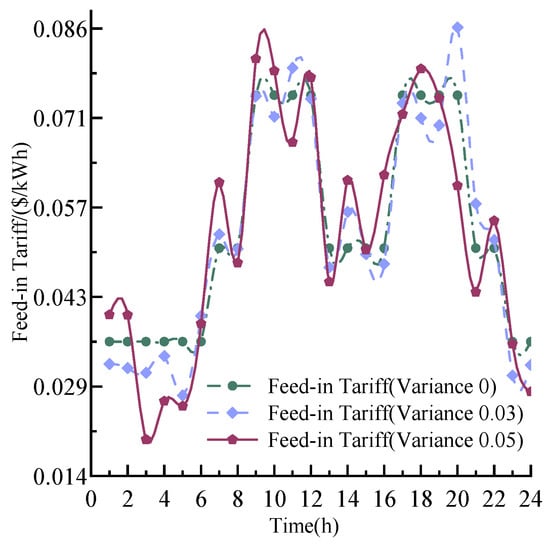 Considering the different development levels of power spot markets in different regions of China, different scenarios are set by changing the variance of the fluctuating price following a normal distribution: 0, 0.03, and 0.05, resulting in grid price curves under three scenarios as shown in Figure 3. Three price scenarios corresponding to three pricing mechanisms. The operating conditions of the variable-speed pumped storage power station under different pricing mechanisms are compared with those of the constant-speed pumped storage power station.