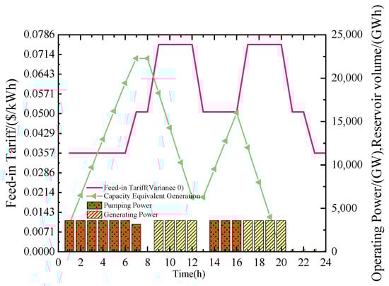 The operating conditions of the variable-speed and constant-speed pumped storage power stations participating in the energy market under three pricing scenarios are shown in Table 4. The optimal daily operation mode of the variable-speed pumped storage power station in Scenario 1 is shown in Figure 4.