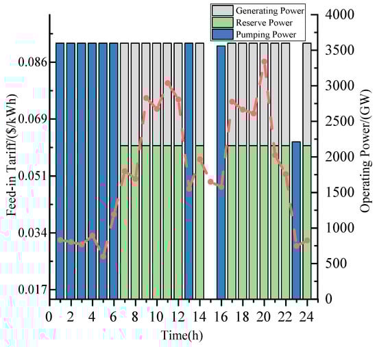 In this section’s case study, the price parameters are taken from Scenario 2 in Section 4.2 The pumping price is set at 0.13, the call proportion is set at 0.1, the spinning reserve price is set at 0.0171 USD/kWh, and the call price coefficient is set at 1.5. The optimal daily operation mode of the variable-speed pumped storage power station in this scenario is shown in Figure 5.