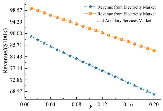 Assuming the on-grid electricity price is fixed, the coefficient determines the revenue of the variable-speed pumped storage power station in the energy market and the ancillary services market. The ratio of the pumping price to the on-grid price is The pumping price significantly affects the operating state and power of the variable-speed pumped storage power station. To study the pricing mechanism in the market environment, the value range of is set from 0.01 to 0.20, with a step size of 0.01. Other parameters are the same as in Section 4.3. The revenue situation of the variable-speed pumped storage power station under different values of coefficient is shown in Figure 6.