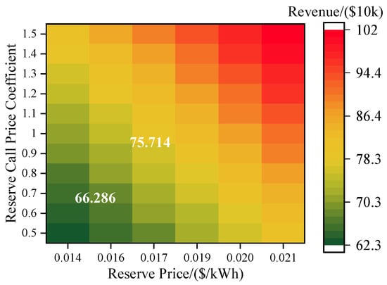 Regarding the pricing mechanism of the ancillary services market, take the spinning reserve market as an example. When the proportion of the called reserve power to the total reserve power in the spinning reserve market is a fixed value, the revenue of the power station in the spinning reserve market is mainly affected by two factors: the pricing of reserve capacity and the coefficient of the called reserve price. Based on these two variables, this paper analyzes the revenue situation of the spinning reserve market and proposes corresponding pricing suggestions. Taking the reserve capacity price in a certain region of China as a reference, the price range of reserve capacity is set from 0.0143 USD/kWh to 0.0214 USD/kWh, with an incremental step of 0.0014 USD; the value range of the called reserve price coefficient is from 1 to 2, with an incremental step of 0.1; other parameters are consistent with those in Section 4.2 The revenue situation of the variable-speed pumped storage power station under different coefficient settings is shown in Figure 7.
