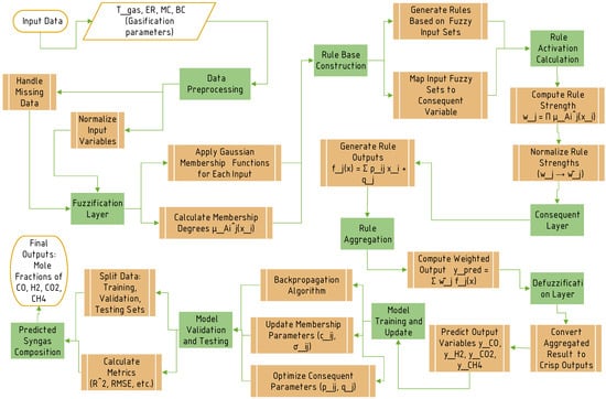 Given the complexity and uncertainty associated with biomass gasification and pyrolysis, there is a growing need for alternative modeling approaches that can handle these challenges effectively. Fuzzy neural networks (FNNs) [,] have emerged as a promising solution for predicting syngas composition and other key outputs in these processes. FNNs combine the advantages of fuzzy logic [,] and neural networks, enabling them to model complex, nonlinear, and uncertain systems.