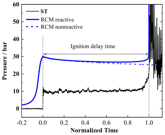 The IDTs obtained from ST and RCM are often used to validate the chemical kinetic mechanism of fuels [8]. However, compared to that of ST, the thermal condition of RCM is less ideal, and its measurements are more intended to be affected by the facility effects [9]. IDTs measured by different STs can usually be compared directly [10], while the measurements of different RCMs cannot [9,11,12]. Two typical pressure traces from ST [13] and RCM [14], respectively, are compared with normalized time, as shown in Figure 1. The thermal condition in ST is built up almost instantly through the compression of a shock wave. In contrast, the compression process in RCM is limited by the piston movement, and noteworthy chemical reactions can take place in this process, shortening the IDT measurement, especially for conditions with higher reactivities. Furthermore, due to the longer time scale of the RCM measurement, the heat transfer between the gas mixture and the chamber wall cannot be neglected, which results in a gradual pressure drop before the ignition, as shown in the RCM nonreactive measurement (replacing O2 with N2 in the mixture) in Figure 1. The heat loss tends to prolong the IDT measurement, especially for conditions with lower reactivities. As a result, RCMs with different geometries and piston movement designs may have distinct measurements of IDTs, even though all of them are “accurate” in the modeling [4,9].