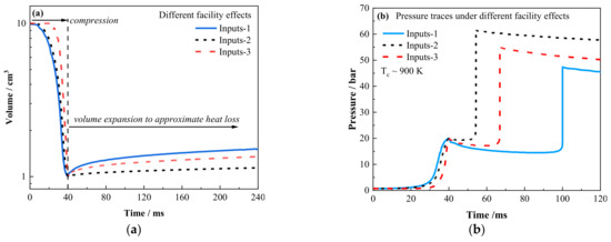 In this study, we adopt three types of volume profiles, mimicking different facility effects, to generate input data, as shown in Figure 3. Inputs-1 and inputs-2 are from the RCM at Xi’an Jiaotong University [11,33], while inputs-3 is from the RCM at the University of Galway. [34]. Inputs-1 to inputs-3 were modified to have the same compression ratio. The inputs-1 has the largest volume expansion rate after the end of compression (EOC), presenting the most severe heat loss, which would typically occur with a short combustion chamber. Inputs-2 follows the same compression process as inputs-1 but with the least heat loss. The compression process of inputs-3 is much faster, and its heat loss is between inputs-1 and inputs-2.