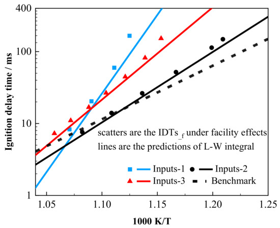 Before applying the inverse method of the L–W integral, we first test the predictive ability of the forward L–W integral method. As shown in Figure 4, the IDTs under different facility effects (inputs-1 to inputs-3) exhibit significant deviations. However, since all the scatter data were calculated using the same chemical kinetic model, these “measurements” are chemically accurate, and any discrepancies arise solely from the facility effects. The dashed line is the adiabatic constant volume simulation result, and its IDTs are given by Equation (7).
