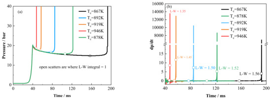 The L–W integral predictions are all slightly lower than the IDTs_f. To figure out the possible explanation, instants of the L–W integral equal to 1 (L–W = 1) are plotted on the pressure traces and pressure differential curves, as shown in Figure 5. When determining the IDT, ignition timing is usually defined as the instant of maximum dp/dt. While the instants of L–W = 1 do not occur where the pressure rises violently but at places where chemical heat release counteracts the heat loss and the pressure begins to rise. Correspondingly, L–W = 1 occurs at points where 0 < dp/dt < 1 in the differential curves, as shown in Figure 5b. In the L–W integral method, ignition is defined as the moment where the ignition carrier reaches its critical concentration. While in the constant volume reactor, the ignition carrier has already gone beyond its critical concentration at the instants of maximum dp/dt due to the feedback of the violent chemical heat release. Therefore, ignition predicted by the L–W integral should always be earlier than that determined by maximum dp/dt in the constant volume reactor.