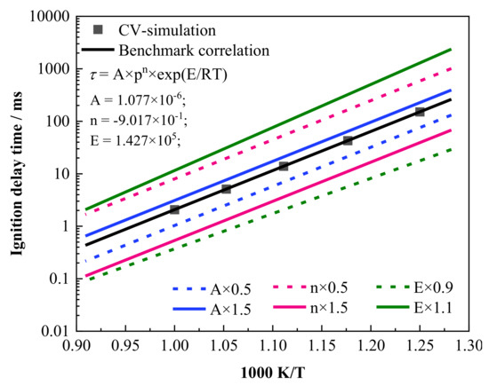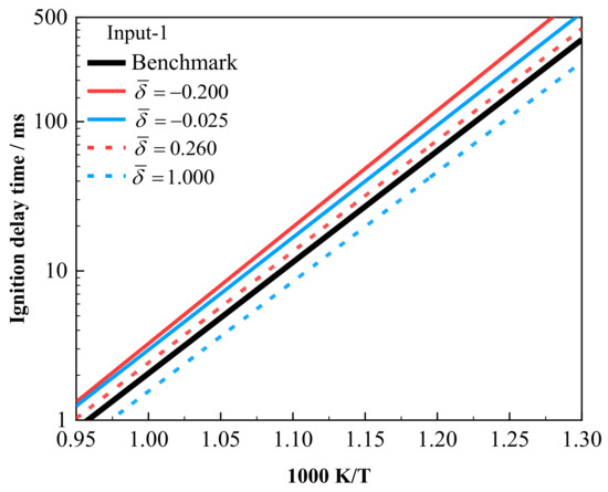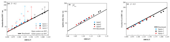 Note that the minimum absolute value of does not guarantee the highest standardization accuracy in the current algorithm, as shown in Figure 9a,b. The IDTs_cv with the minimum absolute are higher than the benchmark by about 30% to 40%, but they exhibit the best consistency. Details of the parameter values and the corresponding for each input set are provided in Table 3. IDTs_cv, with = 0.5, are generally lower than the benchmark by about 20%. At = 0.2, as shown in Figure 9a, the IDTs_cv agree well with the benchmark line, allowing for the direct simulation using a simple constant volume reactor.
