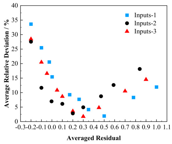 The optimization algorithm minimizes the objective function within the specified ranges of the parameters, reducing the levels of δ to the δt. For each set of input profiles, δ at different temperatures is averaged () to quantify the overall residual of the current correlation. Correlations of inputs-1 with ranging from −0.20 to 1.00 are compared in Figure 7. Detailed values of the parameters and the corresponding are provided in the Supplementary Materials.
