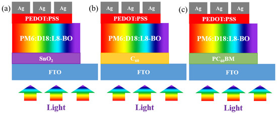 For the reader’s knowledge, these are purely original structure models with a device area of 4.84 mm2 that were designed and performed inspired by a previous study conducted by Zhu et al. [44]. Furthermore, we selected the ETLs SnO2, C60, and PC60BM because of the benefits shown in other studies, as we mentioned previously in the Introduction section as well as Table 1, and due to their high electron mobilities of 2 × 10−9 m2 v−1 s−1, 1.2 × 10−7 m2 v−1 s−1, and 2 × 10−7 m2 v−1 s−1, respectively; additionally, as shown in Table 1, these selected ETLs have a high Tg of 473–573 K, 393–403 K, and 430 K, respectively. The simulated device structures are mentioned in Figure 1.