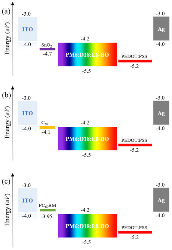 Figure 2a–c represent the energy levels of OSC structures S1, S2, and S3, respectively. All the ETLs in the different structures show cascaded energy levels in terms of the lowest unoccupied molecular orbital (LUMO) between the active layer of −4.2 eV and SnO2, C60, and PC60BM, which are −4.7 eV, −4.1 eV, and −3.95 eV, respectively. The cascaded energy levels create more straightforward pathways in terms of electron and hole transport. PEDOT:PSS forms a close energy level in terms of the highest occupied molecular orbital (HOMO), with an active layer of −5.5 eV. An efficient electron transport further affects the Voc and FF values as analyzed later in Section 3.