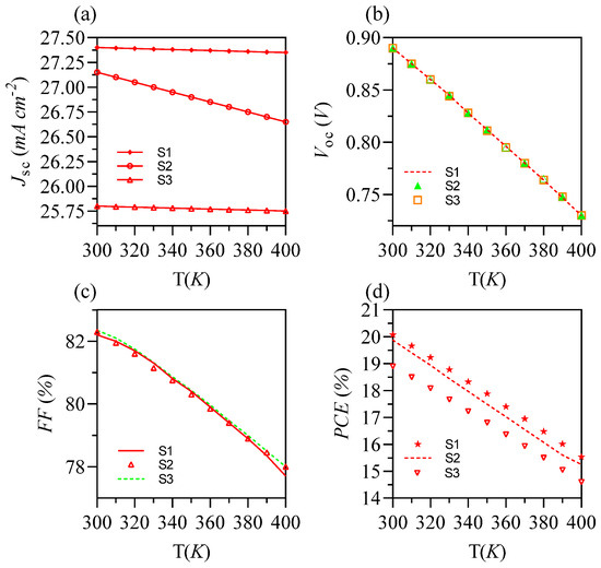 At 400 K, PCE reduced to 14.6%, with a Jsc of 25.76 mA cm−2, a Voc of 0.73 V, and an FF of 78%. According to the findings from the results for S3, it can be observed that the primary factors contributing to the decline in the device’s performance as temperature increases remain consistent with Voc and FF (refer to Figure 3c and Figure 4b,c).