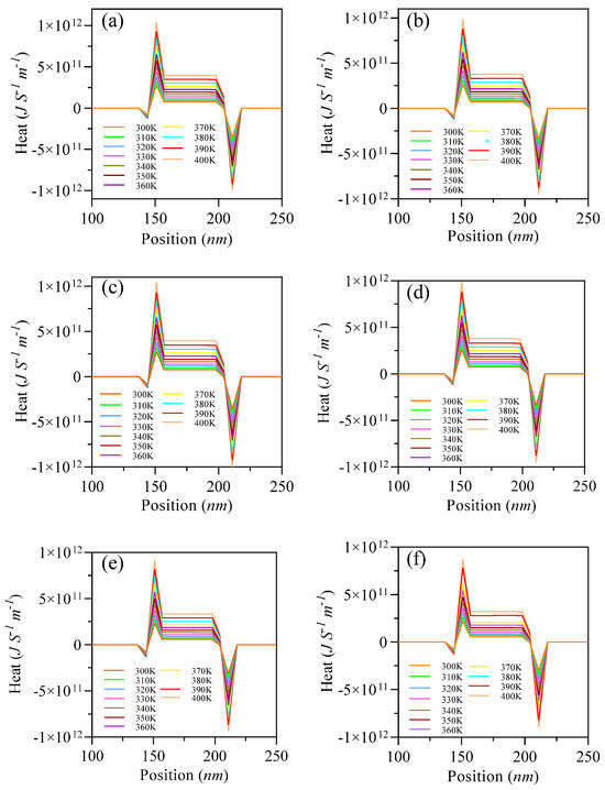 We investigated the electron, hole, and recombination heating for S1, S2, and S3 OSCs to discover the influence of temperature on carrier dynamics and the impact of carrier dynamics on the performance indicators Jsc, Voc, and FF, which affect the PCE and the thermal stability of the devices. The investigation results of the carrier dynamics are depicted in Figure 5 and Figure 6. Figure 5a,c,e represent the electron heating of S1, S2, and S3, respectively. Furthermore, Figure 5b,d,f represent the hole heating in S1, S2, and S3, respectively. We noticed peak values of charge carrier (electron and hole) heating in the position of 150 nm and saw increased electron heating values within the temperature range of 300–400 K. At 300 K, the devices showed peak values of 2.78 × 1011 J S−1 m−1, 2.75 × 1011 J S−1 m−1, and 2.3 × 1011 J S−1 m−1 for S1, S1, and S3, respectively. Furthermore, at 400 K, the devices showed 1.04 × 1012 J S−1 m−1, 1.05 × 1012 J S−1 m−1, and 9.28 × 1011 J S−1 m−1 for S1, S2, and S3, respectively. At the same position, the devices showed increased hole heating values within the temperature range of 300–400 K; at 300 K, the devices showed peak values of 2.57 × 1011 J S−1 m−1, 2.63 × 1011 J S−1 m−1, and 2.22 × 1011 J S−1 m−1 for S1, S2, and S3, respectively, while at 400 K, the results were 9.84 × 1011 J S−1 m−1, 9.86 × 1011 J S−1 m−1, and 8.74 × 1011 J S−1 m−1 for S1, S2, and S3, respectively.
