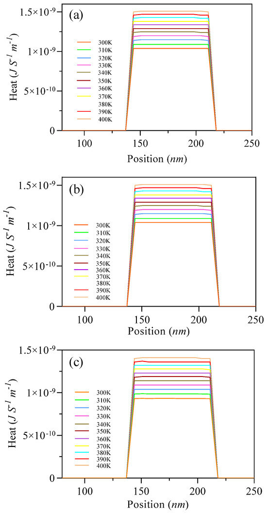Figure 6. (a) Recombination heating of S1 for temperature range of 300–400 K; (b) recombination heating of S2; (c) recombination heating of S3.
