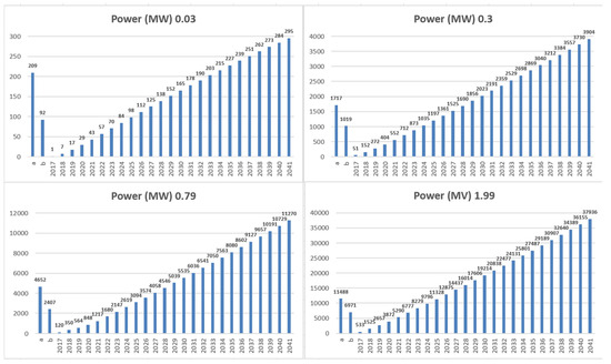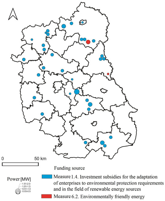 The beneficiaries of the program were local government units (JST—pl. jednostki samorządu terytorialnego) and their unions, agreements, associations, local government organizational entities of the public finance sector with legal personality, commercial law companies in which JST or their unions hold the majority of shares or stocks, and entities acting based on the Law of 19 December 2008, on public-private partnerships [45]. The value of co-financing for projects not covered by public aid was up to 85% of eligible costs. The aid could be granted for projects implemented in towns belonging to rural municipalities or urban-rural municipalities, except for towns with more than 5000 inhabitants or in towns belonging to urban municipalities with less than 5000 inhabitants. The maximum amount of aid for implementing projects in the production or distribution of energy from renewable sources in one municipality during the period of the program could not exceed PLN 3 million. PLN 265.5 million was allocated for projects using renewable energy sources under this measure, which accounted for 5.9% of the allocation of all ROP LP funds. More than 93% of this amount was allocated to “solar energy” investments. Such a significant share of solar energy projects confirms the validity of the thesis of the Program for the Development of Renewable Energy Sources for the Lubelskie Voivodeship (PROZEWL) [46], that the region’s nationally significant resources will allow it to become a national leader in the use of solar energy for heat and power generation.