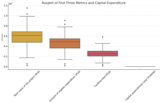 The boxplot (Figure 2) illustrates the distribution of four key metrics related to project financing and expenditures: Total value of the project (PLN); Amount of eligible expenditure (PLN), Funding total (PLN); and Capital expenditures (PLN/kW). The first three metrics, expressed in millions of PLN, exhibit considerable variability, reflecting the diversity in project scales. In contrast, “Capital expenditures”, measured in PLN per kilowatt, shows a more compact and consistent distribution.