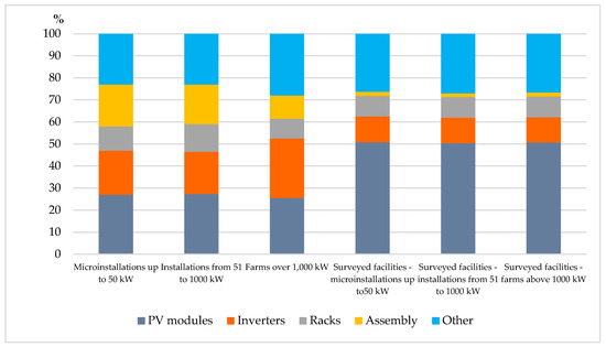 The average level of expenditure per unit of installed capacity was 6088 PLN/kW but this varied significantly, from 4919 to 7285 PLN/kW (Figure 3), and was not due to economies of scale. Institute for Renewable Energy (IRE) analyses confirm the operation of the so-called cost effect of scale, as the data shows that the unit price of an installation decreases with the increase in the installation’s rated power. There are noticeable differences in the unit price between home prosumer installations and prosumer business installations. The unit price is significantly lower for PV farms than for other types of installations [52].