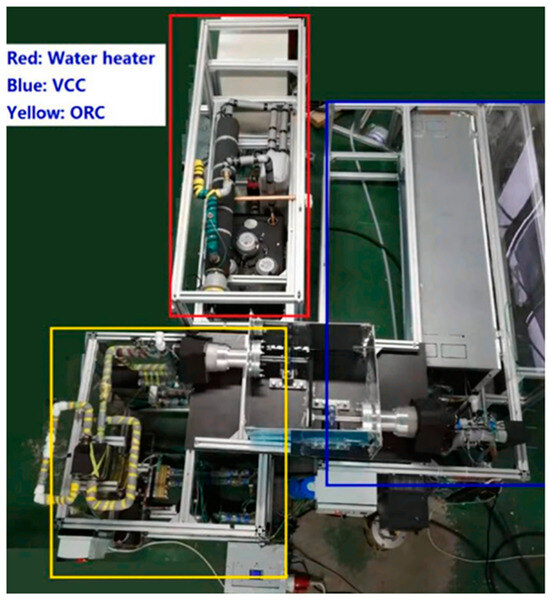 Wang et al. (2011) [81] contributed key insights into ORC–VCC designs. In 2012, they created a prototype with R245fa in the ORC and R134a in the VCC, using a hot oil loop at 200 °C to simulate waste heat. The system produced up to 4.4 kW of cooling, with a COP of 0.48 under off-design conditions. A 2013 theoretical study evaluated different ORC–VCC configurations, focusing on ORC recuperation and VCC subcooling, achieving a peak COP of 0.66 with R245fa as the common refrigerant.