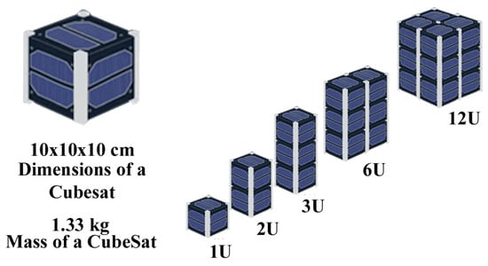The CubeSat, developed in 1999 by professors Jordi Puig-Suari (California Polytechnic State University) and Bob Twiggs (Stanford University), is a standardized nanosatellite with dimensions of 10 × 10 × 10 cm, weighing up to 1.33 kg, as shown in Figure 1. One of its most notable advantages is the ability to be constructed entirely from COTS (Commercial Off-The-Shelf) components, which ensures adaptability to various mission requirements while maintaining low production costs. Additionally, its power consumption is minimal, estimated at only a few watts [7]. This standardization of size, mass, and capacity aimed to simplify satellite control and enhance payload flexibility, making it a popular choice for nanosatellite missions, with launch costs typically ranging from $50,000 to $200,000 [9,10].