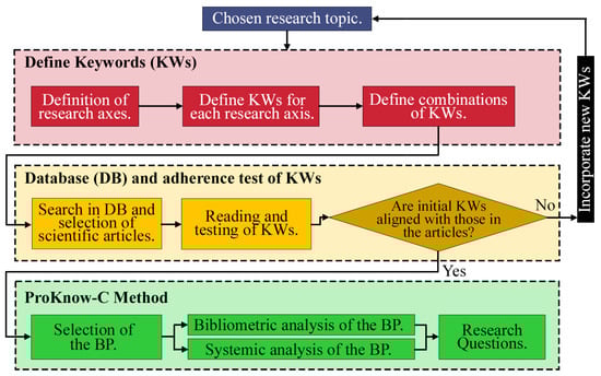 The selected articles undergo a validation of the KWs through a verification of those present in the articles and are subsequently subjected to a bibliometric and systemic analysis. These steps form the primary stage of the ProKnow-C process, which consists of the following stages: selection of the BP; bibliometric analysis of the BP; Systemic analysis of the BP; and research question, as shown in Figure 3.