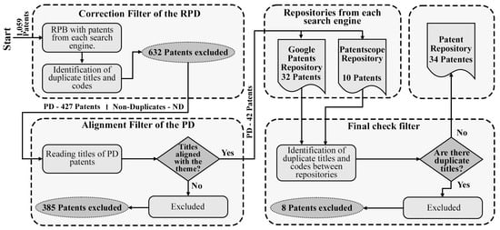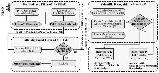 As a result, the RAD contained 1309 titles, representing a loss of 15.76%. Subsequently, filtering actions were carried out to verify if the articles aligned with the proposed topic to obtain the K and P repositories, as described in the flowchart in Figure 4 [31]. At the end, 175 articles were obtained, whose citation numbers were verified on Google Scholar on 23 January 2024.