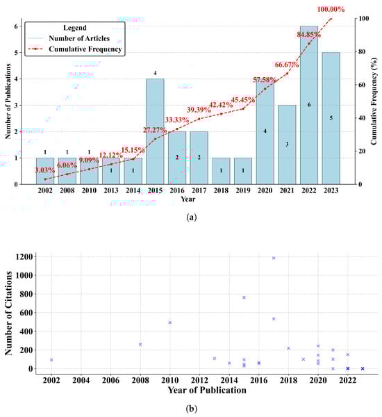 The initial analysis of the 33 articles that composed the BP was structured according to the year of publication and academic relevance within the stipulated period. Figure 6a illustrates the historical distribution of the number of annual publications along with their cumulative frequency.