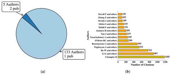 Another important analysis for determining the academic relevance of the BP, in addition to the annual publication of articles, is the recognition of the authors related to the proposed topic. In this case, a total of 138 authors were identified. Despite the number, it was found that 133 authors (96.38%) were present in only one publication, while only 5 authors (3.62%) had two publications. This distribution of the number of authors per article is illustrated in Figure 7a, which shows that even with the number of articles produced between 2020 and 2023, there were still not many branches of the proposed topic.