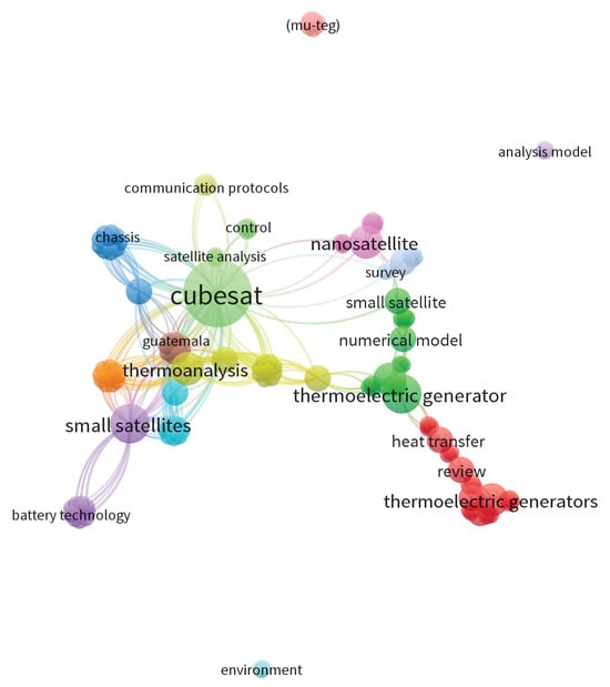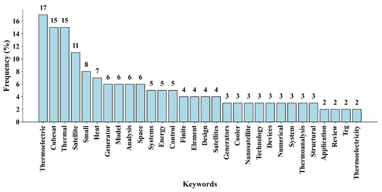 Even though the term “Thermoelectric” was the most frequently used in the BP, the terms “CubeSat” (second) and “Thermal” (third) held significant relevance in this KW analysis. Despite their individual positions, combined, they totaled 30 occurrences (17.96%), indicating their high usage in combination (or separately) for studies related to the proposed research topic. Additionally, among the 30 most cited KWs, terms like “Finite”, “Element”, “Numerical” and “Thermoanalysis” suggested the use of computational tools applied to the problem of thermal simulations in nanosatellites.
