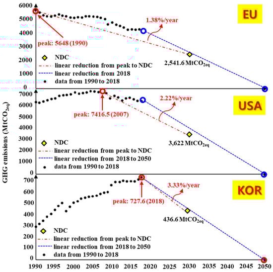 Human-induced global greenhouse gas (GHG) emissions have increased since the industrial revolution. Despite a 3.7% decrease in global GHG emissions in 2020 from 2019, driven by the COVID-19 pandemic, it rebounded to a record-breaking 53.85 Gt CO2eq [,]. This implies that global GHG emissions are increasing. However, the Intergovernmental Panel on Climate Change 6th assessment report states that global GHG emissions should decrease by more than 45% by 2030 from 2010 levels to limit the increase in global average temperature within 1.5 °C, and carbon neutrality should be achieved by 2050 []. In response, countries have agreed to submit their nationally determined contribution (NDC) to the UN Framework Convention on Climate Change every five years to intensify efforts to curb GHG emissions. The data on GHG emissions from 1990 to 2018 and the declared NDC by country are shown in Figure 1. Almost all countries determined their 2030 NDC based on the reference year and did not provide any reason for it. Similarly, the Republic of Korea declared its 2030 NDC, considering the annual GHG emissions in 2018 as reference. The peak GHG emissions of EU, USA, and the Republic of Korea were 5648.0 MtCO2eq in 1990, 7416.5 MtCO2eq in 2007, and 727.6 MtCO2eq in 2018, respectively. The declared 2030 NDCs of the EU, USA, and Republic of Korea are 2541.6, 3622, and 436.6 MtCO2eq [], with reductions of 55%, 51%, and 40%, respectively, compared to the peak GHG emissions of each country. To achieve the 2030 NDC of each country, the required annual reduction rates are 1.38%, 2.22%, and 3.33% for the EU, USA, and Republic of Korea, respectively. It is plausible that the relatively slower onset of economic growth in the Republic of Korea compared to the EU and the USA has contributed to its challenging annual reduction rate in GHG emissions.