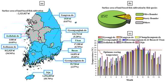 Surface area of land-based fish cultivation in the Republic of Korea in 2021: (a) by region, (b) by fish species, and (c) monthly average surface water temperature in 2021. Note: the red line indicates the optimum rearing temperature for olive flounder.