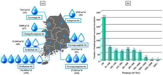 Current status of underground seawater boreholes in the Republic of Korea: (a) regional pumpage and (b) distribution of underground seawater boreholes by pumpage. Note: a full droplet refers to a pumpage of 10,000 m3/day.