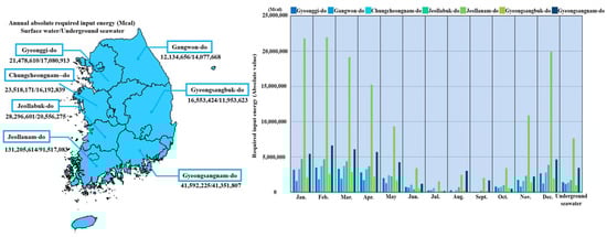 Annual and monthly required input energy comparison for olive flounder cultivation using surface water and underground seawater by region in the Republic of Korea.