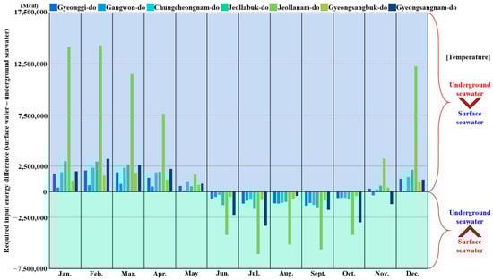 Monthly required input energy difference between surface water and underground seawater for olive flounder cultivation by region in the Republic of Korea.