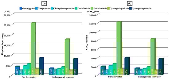 Figure 6a illustrates the required input energy for the surface water and underground seawater used for heating or cooling annually, considering the seasonal surface water temperatures and COP. The total required input energy for surface water is 54,209 MWh, while for underground seawater is 41,128 MWh, which corresponds to a 24.1% reduction. Notably, the use of underground seawater had a significant impact in Chungcheongnam-do and Jeollanam-do, with both regions showing a reduction rate of approximately 31%. This result is attributed to the temperature differential between the surface water and underground seawater, particularly during winter, and the available daily pumpage. However, a negative effect was observed in Gangwon-do, where the required input energy increased by approximately 16% when switching from surface water to underground seawater. This can be explained by the lower underground seawater temperature compared to that in other regions, while the surface water temperature in winter was relatively higher. The temperature difference between the average annual surface water temperature and underground seawater in Gangwon-do is the smallest, with average annual temperatures of 16.5 °C and 15.6 °C, respectively. This results in an increased input energy when seawater is used for olive flounder cultivation in Gangwon-do. Overall, the use of underground seawater generally resulted in lower input energy requirements compared with surface water across most regions. These observations are consistent with the CO2 emissions estimates presented in Figure 6b, which show a similar trend.