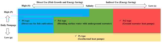 According to the literature [], the utilization of underground seawater can be classified based on salinity levels and daily pumpage rates, as shown in Figure 7. A survey conducted with fishermen establishes the criteria for optimal salinity and daily pumpage as 20% and 100 m3, respectively. As illustrated in Figure 7, underground seawater utilization can be classified into direct and indirect applications. The PS type represents conditions characterized by high salinity and sufficient daily pumpage rate. This type is advantageous for reducing energy costs associated with heating or cooling seawater and enables year-round fish growth, regardless of seasonal variations. Similarly, the Ps1 type involves an adequate daily pumpage rate but an intermediate salinity level. For this type, blending surface water with underground seawater is recommended to meet the requirements for direct use. In contrast, Ps2 and ps types are more appropriate for indirect applications because their salinity and daily pumpage rates do not meet the conditions necessary for optimal fish cultivation.